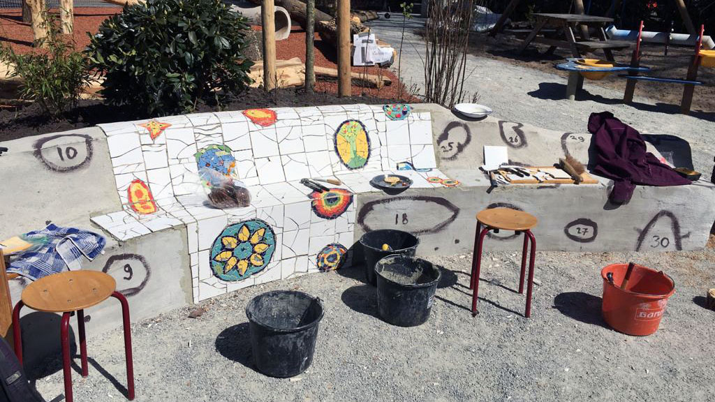 De eerste mozaïek bank is af en we hebben veel leuke reacties gekregen. Het is een echte eye-catcher geworden in de vernieuwde speeltuin. Door zijn witte uiterlijk springen de knallende, gekleurde symbolen er echt uit.