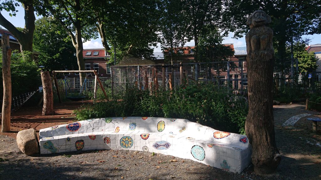 Monique en ik hebben samen de mozaïek ontwerpen voor op de nieuwe banken gemaakt. Deze banken zijn gelegen op het Bankapleintje, het centrale punt van de vernieuwde speeltuin. Zoals de rest van het ontwerp van de speeltuin, zijn de mozaïek ontwerpen geïnspireerd door Indonesië.